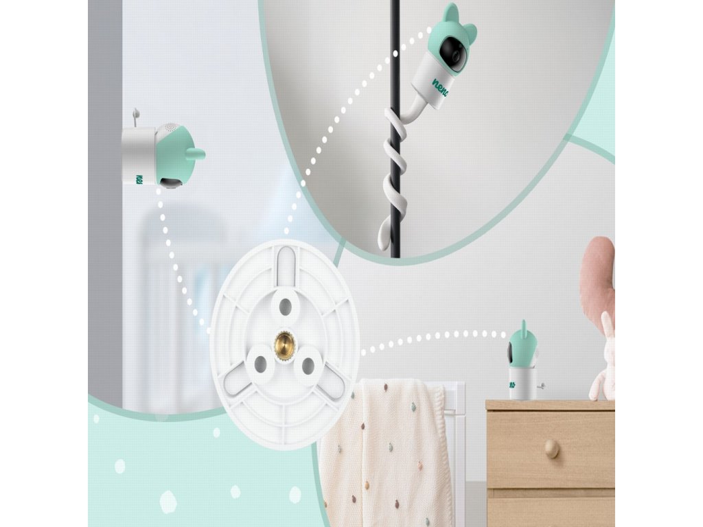 - Rychlá a snadná montáž – flexibilní držák umožňuje uchycení na stěnu, strop i postýlku.