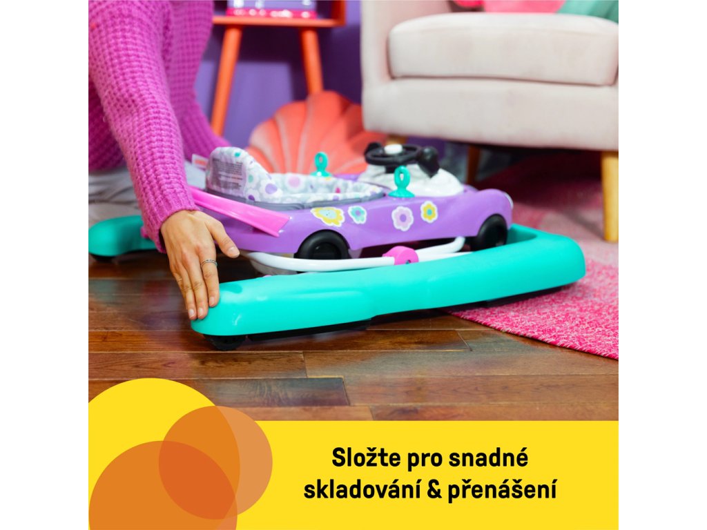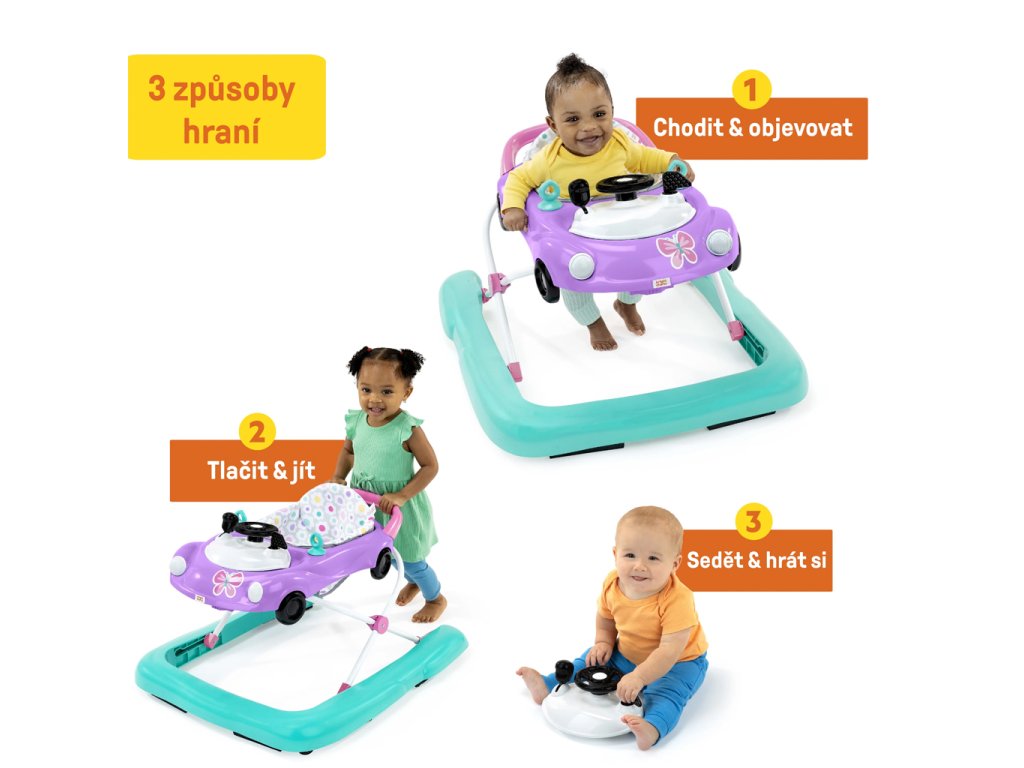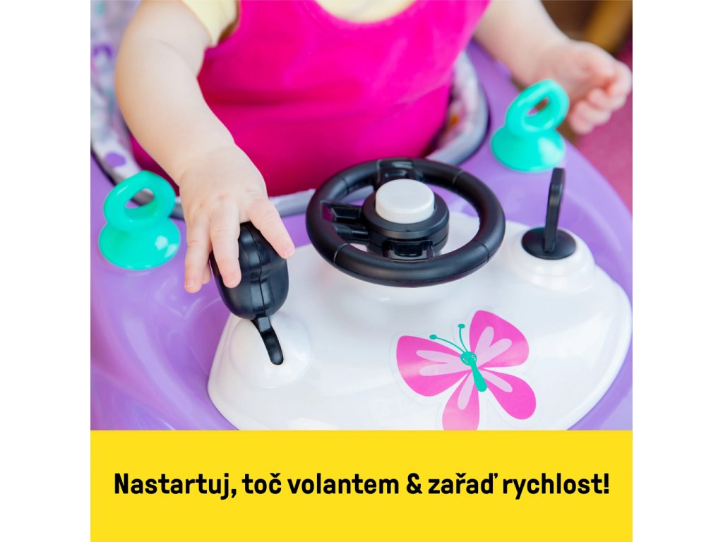 Toto dětské chodítko Purple Power nabízí 3 režimy růstu s děťátkem: tradiční auto chodítko, chodítko a přenosnou hračku. Spolu s volantem, řadící pákou a klíčem od auta pro „zapnutí“ zábavy můžete posadit děťátko na sedadlo řidiče a rozvíjet jeho jemné motorické dovednosti. Zamilují si zkoumání detailů auta a řízení jako máma a táta... a volant vydává zábavné cvakavé zvuky pro multismyslovou zábavu.Začněte závodit s děťátkem ve věku od 6 měsíců do 2 let nebo více — chodítko roste s dítětem od brzkého objevování až po první krůčky až po expertní úroveň „řidiče“. A s přiloženými nálepkami s motýlem a květinkami můžete přizpůsobit novou jízdu miminka. Vaši prckové nebudou schopni potlačit jejich chichot, když budou jezdit po chodbách s mámou a tátou, kteří je povzbuzují.
