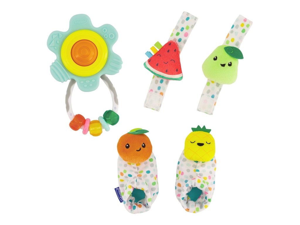 Sada chrastítek pro nejmenší je ideální jako první dárek pro miminko. Chrastítko ve tvaru květiny má tvar pro snadné uchopení. Pozornost dítěte upoutají pohyblivé různobarevné kroužky na rukojeti i chrastící korálky v průhledné kuličce uprostřed hračky. Okvětní plátky květiny slouží jako kousátka, která dítěti pomohou při prořezávání prvních zoubků. Navlékací bačkůrky na nožičky a chrastítka na ruce s veselými obličeji ve tvaru ovoce podněcují rozvoj sluchu, zraku a hmatu dítěte. Dítě při kopání nožičkami i při pohybu ručičkami sleduje a zkoumá pohybující výrazné barvy hračky. Díky připevnění na nožičky či ruce vydrží dítěti hra dlouhou dobu, protože mu hračka nemůže upadnout. Různorodé textury pro zkoumání pomáhají rozvoji hmatu. Vhodné pro děti od narození.Doplňkové parametry