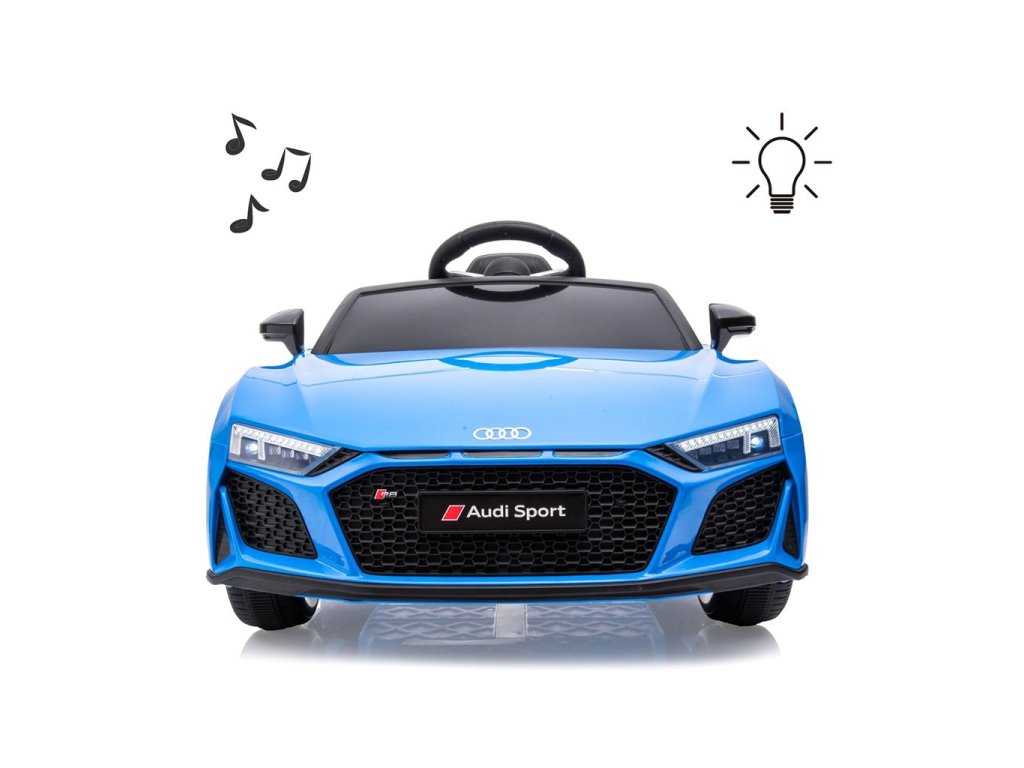 Po sešlápnutí plynového pedálu tohoto úžasného Audi R8 Spyder se vozidlo rozjede a zároveň se rozsvítí přední světlomety díky dvěma motorům. Velká, široká EVA kola s běhounem a sportovními ráfky zajistí mobilitu při výletech mimo domov, zatímco profilované sedadlo poskytne dítěti pohodlí a bezpečnost. Ocelové nápravy kol zajišťují stabilitu a odolnost vozidla. Zábava nekončí: hudební funkce na kokpitu, USB port, Bluetooth, přehrávání hudby, ovládání hlasitosti +/- , 4 písně po stisknutí tlačítka na volantu vlevo, zvuk klaksonu po stisknutí tlačítka na pravé straně volantu – to vše činí hru ještě zajímavější!