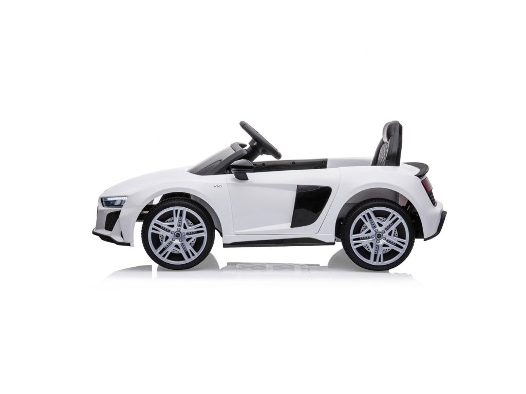 Autíčko na akumulátor, stejně jako jeho originál, je kombinací sportovního designu a klasického charakteru. Vozidlo je vyrobeno s důrazem na nejmenší detaily z vysoce kvalitních materiálů, které se vyznačují vysokou odolností a bezpečností. Ovládejte elegantní volant vozidla Audi R8 Spyder a cítíte se jako skutečný řidič sportovního auta. Stejně jako originální Audi R8 Spyder, i naše akumulátorové vozidlo díky horizontálním liniím vpředu vypadá širší a nižší, zatímco po stranách dominují panely Sideblades a mřížky výstupu vzduchu vzadu, což vytváří jedinečný charakter vozidla. Vozidlo vzbuzuje obdiv svou přítomností a možností jízdy s otevřenou střechou – kabriolet. Pohodlné velké profilované sedadlo R8 s bezpečnostním pásem je výhodou a komfortem pro dítě. Ovládání na dálkový ovladač, který má funkci blokování rychlosti - P, označení jednoho z 3 stupňů rychlosti – S, funkce zatáčení a jízdy vpřed a vzad.