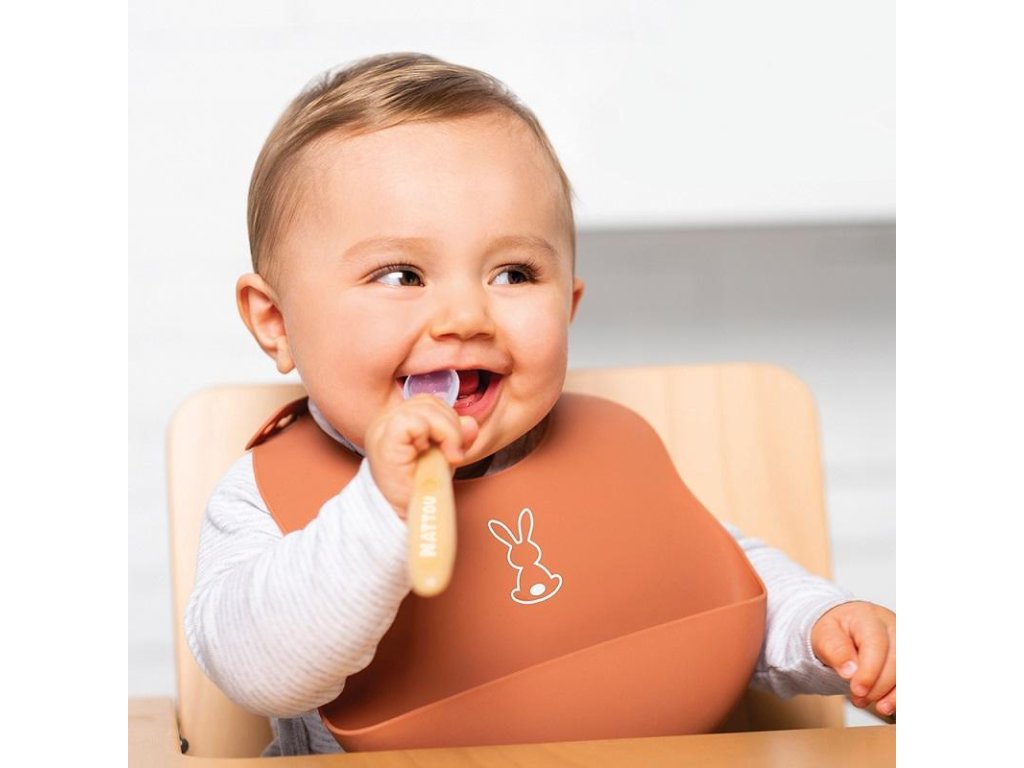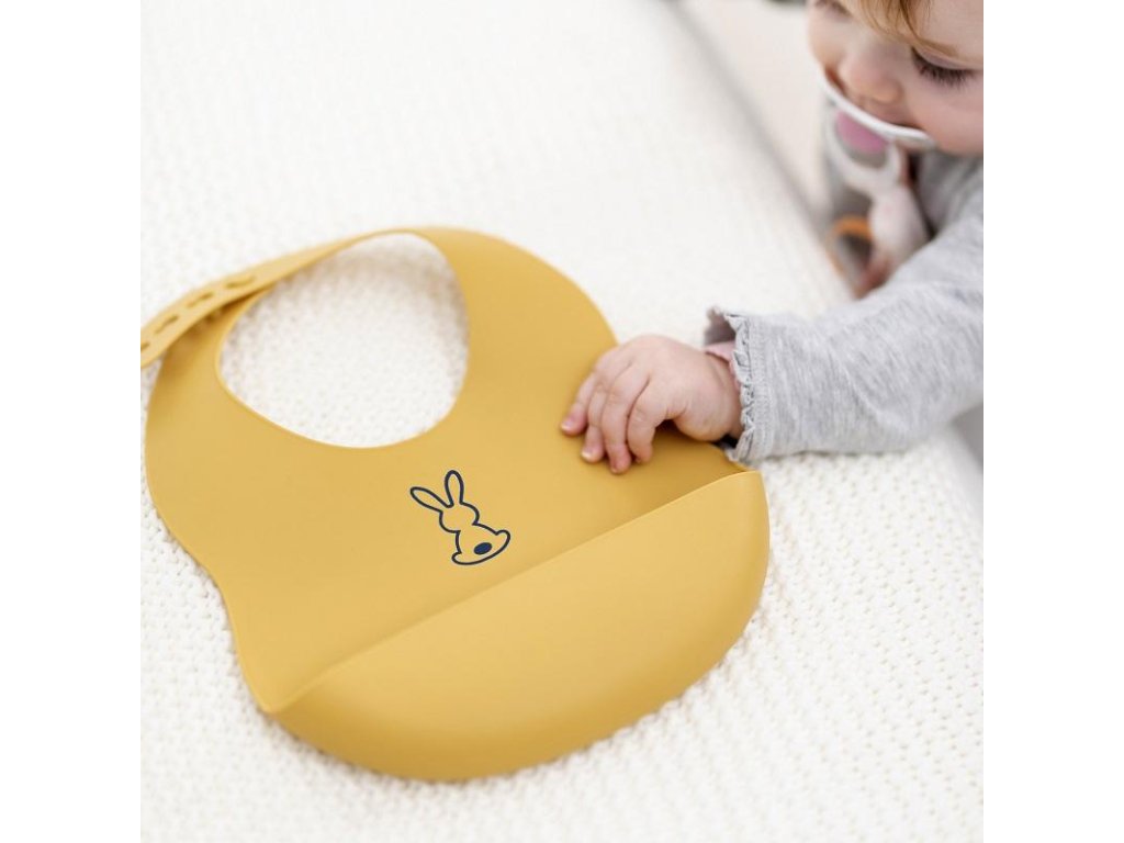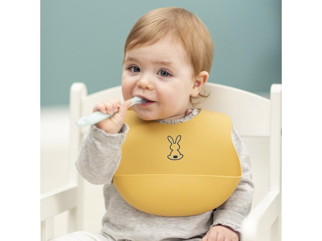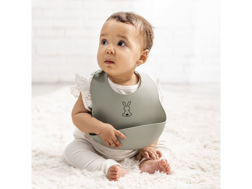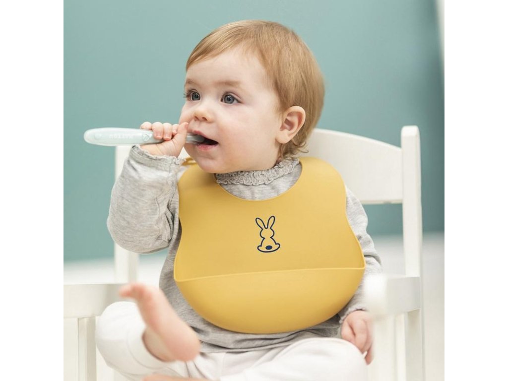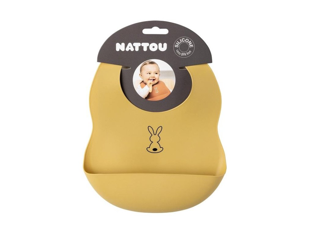 Dětský silikonový bryndák Nattou se zapínáním vyrobený z pružného silikonu s motivem roztomilých králíků a praktickou sběrnou částí zajistí krmení a jedení vašeho děťátka bez zbytečného stresu z nepořádku.Vlastnosti:
