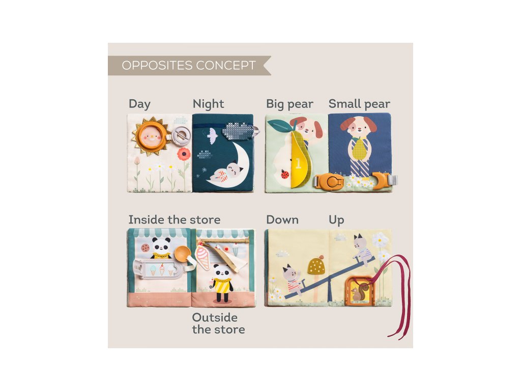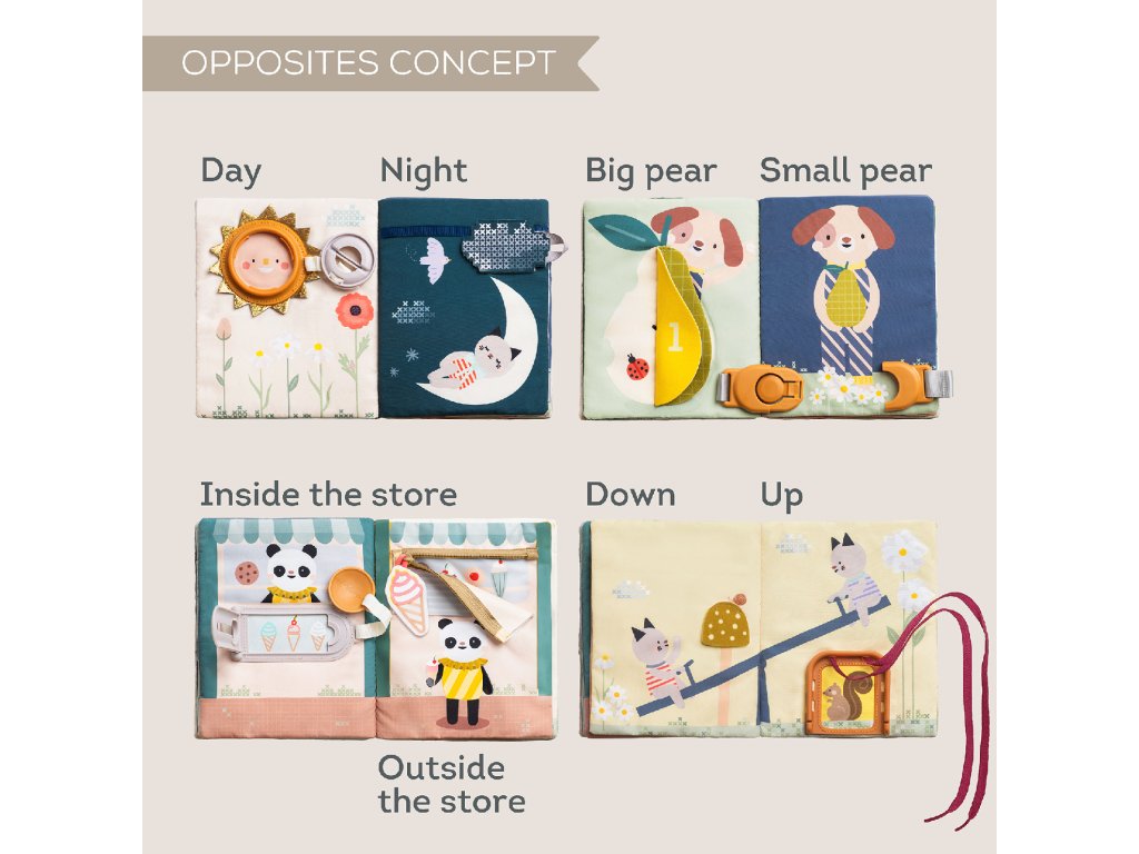 Objevování světa protikladů nebylo nikdy zábavnější! Tato barevná a interaktivní kniha plná různorodých aktivit představuje dětem základní pojmy jako velký & malý nebo den & noc a přitom rozvíjí jemnou motoriku, jazyk i první matematické dovednosti. 15 interaktivních aktivit - zipy, přezky, tkaničky nebo schovávačky – vše, co malé ručičky potřebují k procvičení dovedností jako je zapínání, vázání a oblékání Praktická na cesty - lehká a kompaktní, zabaví dítě kdykoliv a kdekoliv, ideální do auta, do kočárku nebo na návštěvu Co rozvíjí: Jemnou motoriku - zipování, zapínání a další aktivity posilují koordinaci ruky a prstů, přípravují dítě na kreslení a psaní Základy matematiky - hravé úkoly s čísly rozvíjí první matematické dovednosti jako počítání a rozpoznávání čísel Kreativitu a řešení problémů - děti se učí přemýšlet, objevovat a používat svou fantazii prostřednictvím interaktivních ilustrací Vhodné pro děti od 18 měsíců.Doplňkové parametry