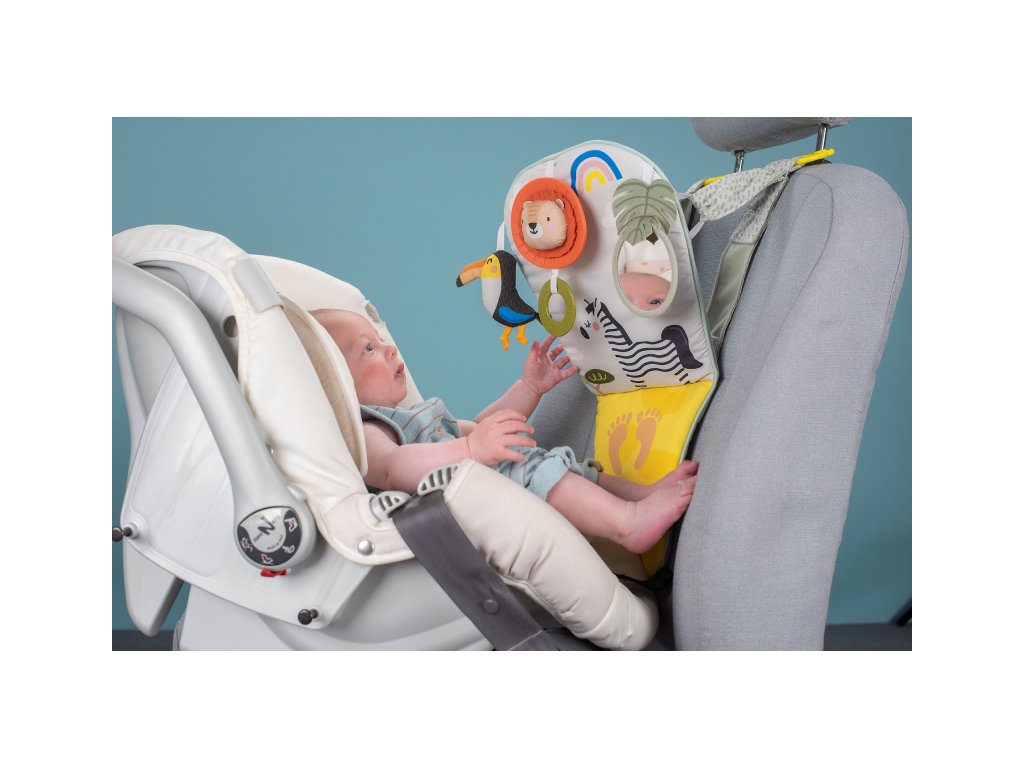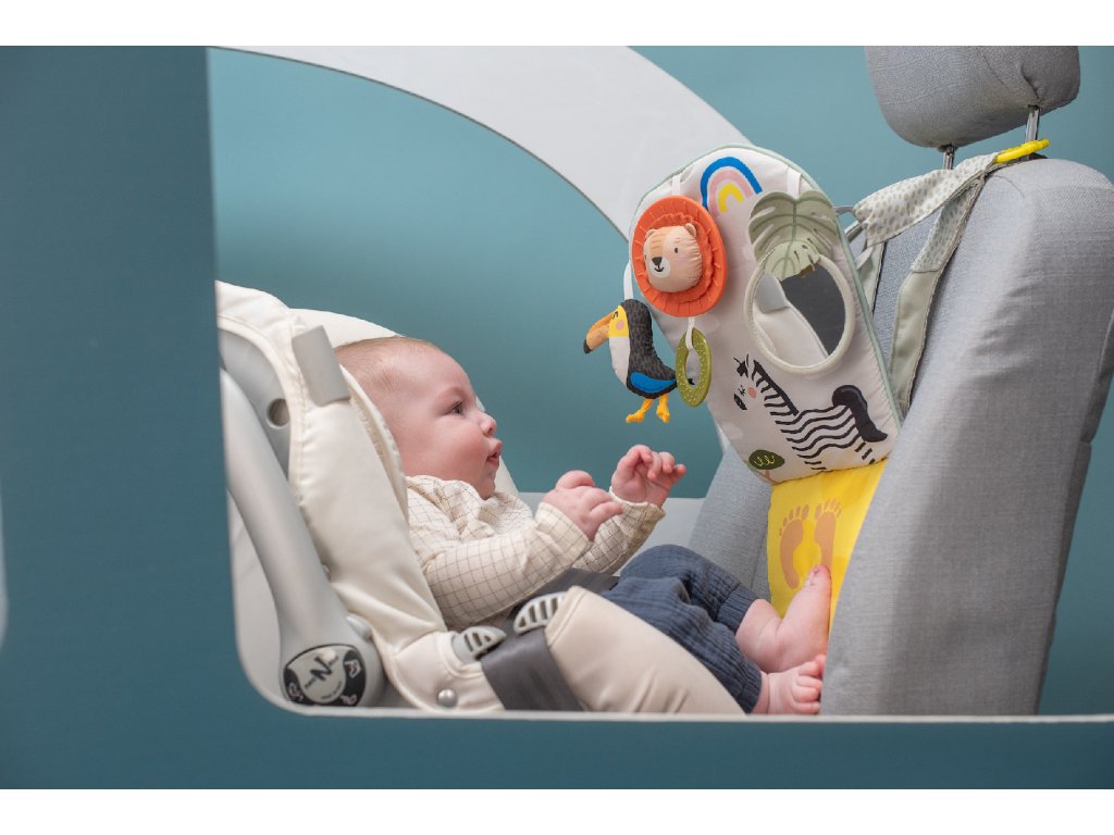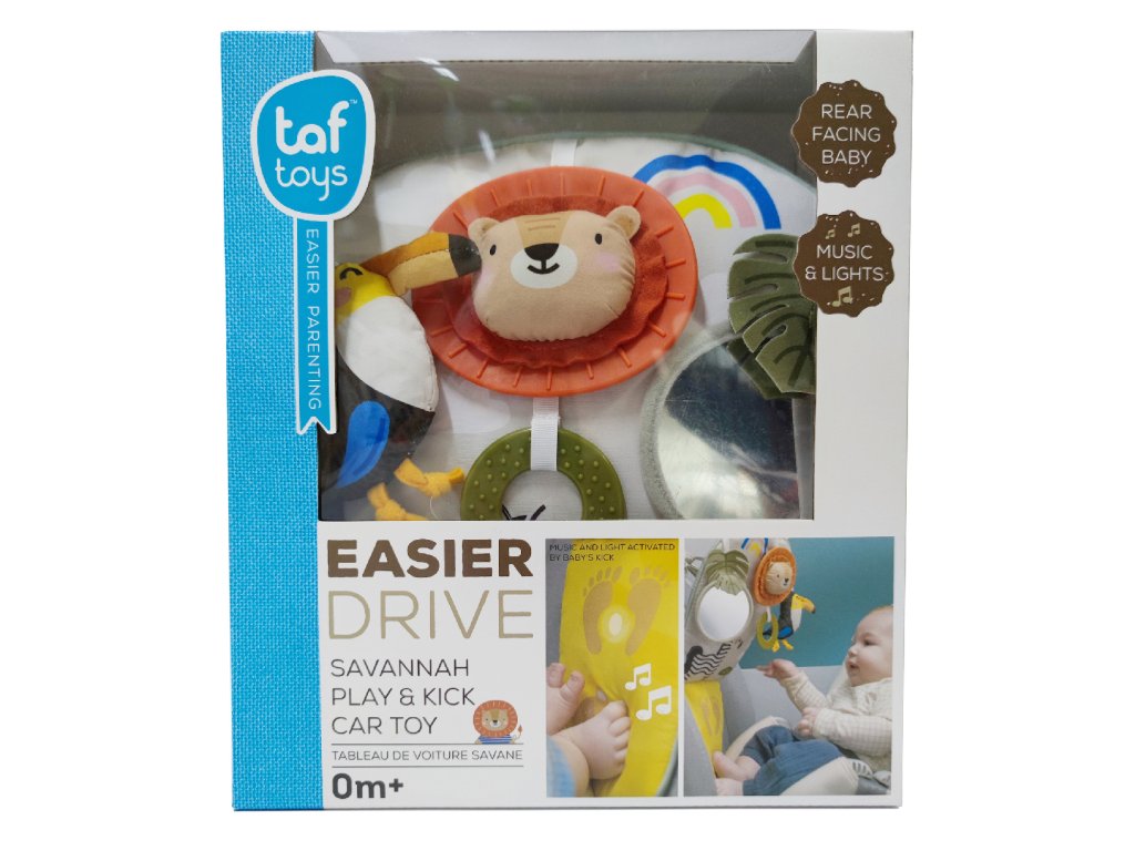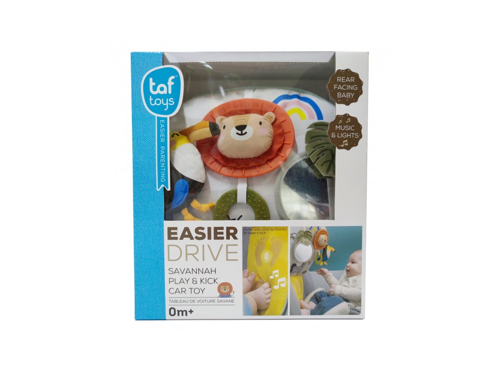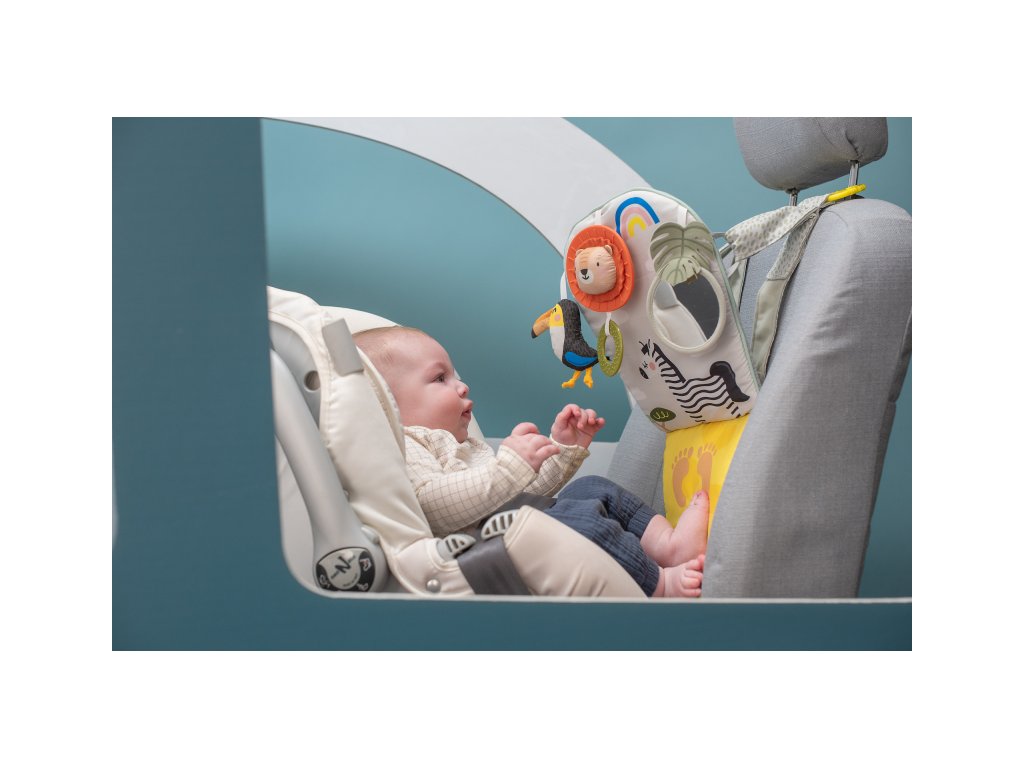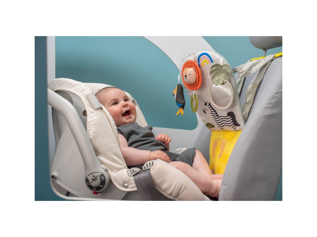 Dětský hudební pultík do auta Taf Toys Savana - hrací pultík do auta Taf Toys s hudbou a světélky zabaví vaše miminko na cestách autem a zajistí vám klid při řízení. Pultík se připevňuje na sedadlo nad autosedačku proti směru jízdy. Hudbu i světýlka dítě aktivuje kopáním svých nožiček do spodní části pultíku. Dítě se tak učí příčině a následku a rozvíjí své motorické dovednosti. Tři zavěšené hračky - chrasticí tukan, cinkající lev s kousátkem a bezpečné zrcátko - lákají ke zkoumání a podněcují rozvoj smyslů dítěte. Pultík snadno připevníte s pomocí plastových kroužků na opěrku hlavy na sedadle před dítětem. Baterie 3xAG13 (LR44) jsou součástí. Vhodné od narození.Doplňkové parametry