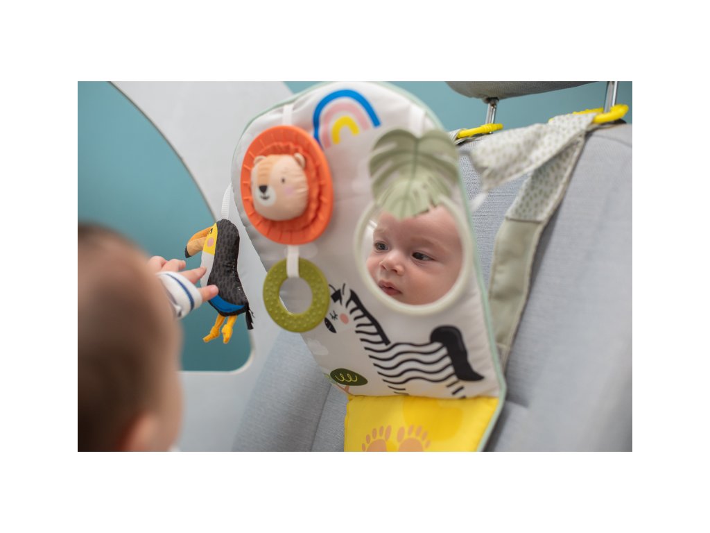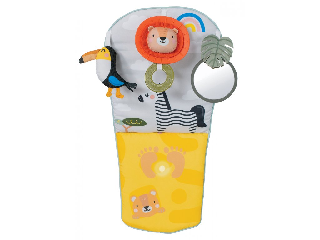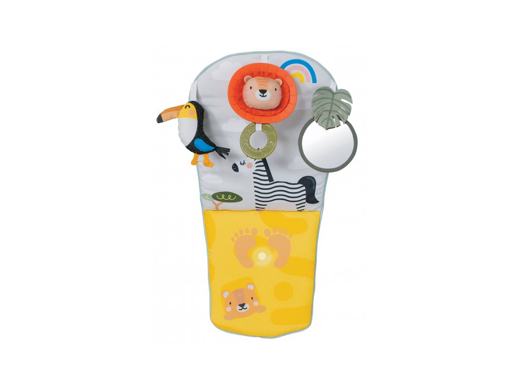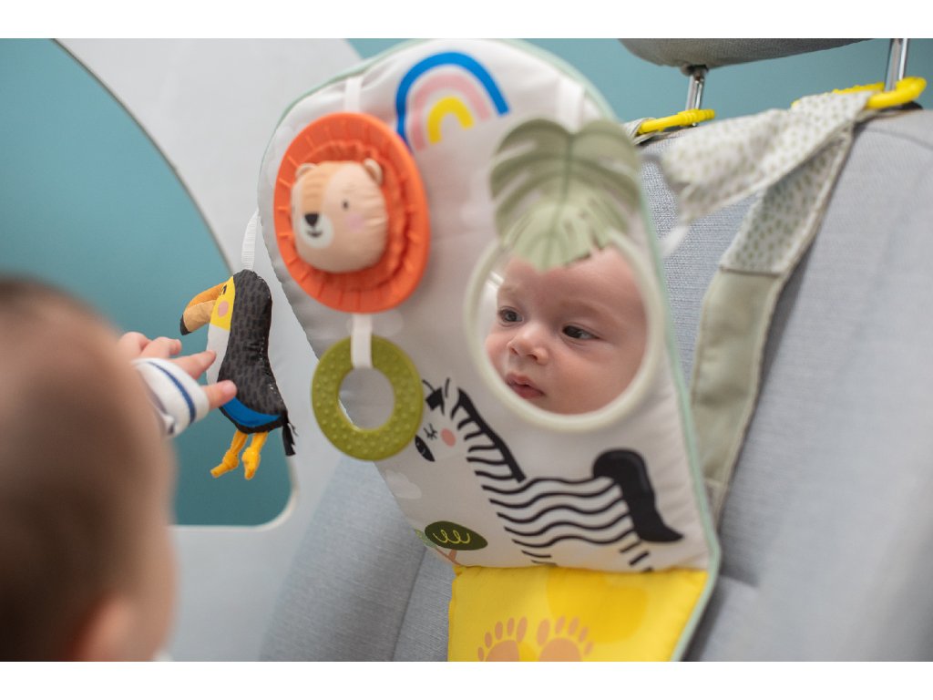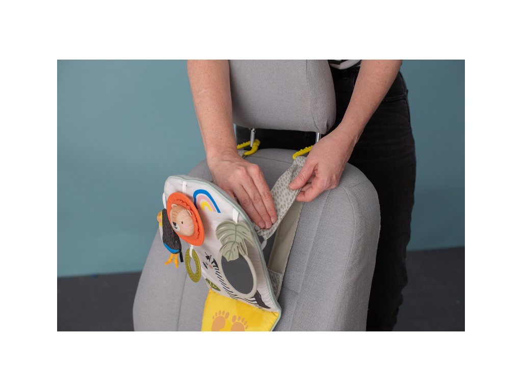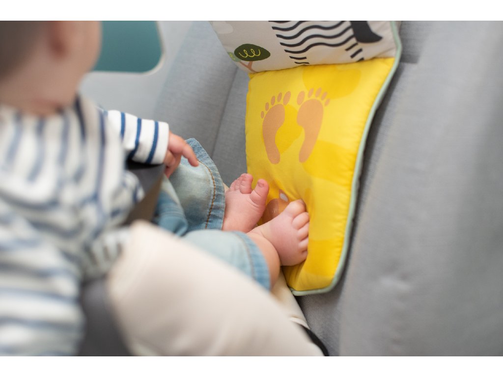 Dětský hudební pultík do auta Taf Toys Savana - hrací pultík do auta Taf Toys s hudbou a světélky zabaví vaše miminko na cestách autem a zajistí vám klid při řízení. Pultík se připevňuje na sedadlo nad autosedačku proti směru jízdy. Hudbu i světýlka dítě aktivuje kopáním svých nožiček do spodní části pultíku. Dítě se tak učí příčině a následku a rozvíjí své motorické dovednosti. Tři zavěšené hračky - chrasticí tukan, cinkající lev s kousátkem a bezpečné zrcátko - lákají ke zkoumání a podněcují rozvoj smyslů dítěte. Pultík snadno připevníte s pomocí plastových kroužků na opěrku hlavy na sedadle před dítětem. Baterie 3xAG13 (LR44) jsou součástí. Vhodné od narození.Doplňkové parametry