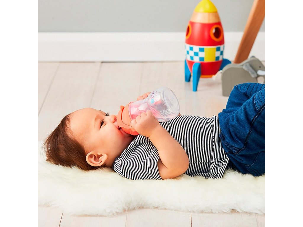 Závažíčko na konci brčka se pohybuje spolu s nápojem a lze tak pít z hrnečku pod jakýmkoli úhlem a umožní tak dětem vypít nápoj až do poslední kapky! Silikonové brčko s dvoucestným ventilem umožňuje snadné pití a zároveň zabrání rozlití. Jednoduché ergonomické úchyty na hrnečku a snadné odklopení víčka podporují samostatnost vašeho dítěte.