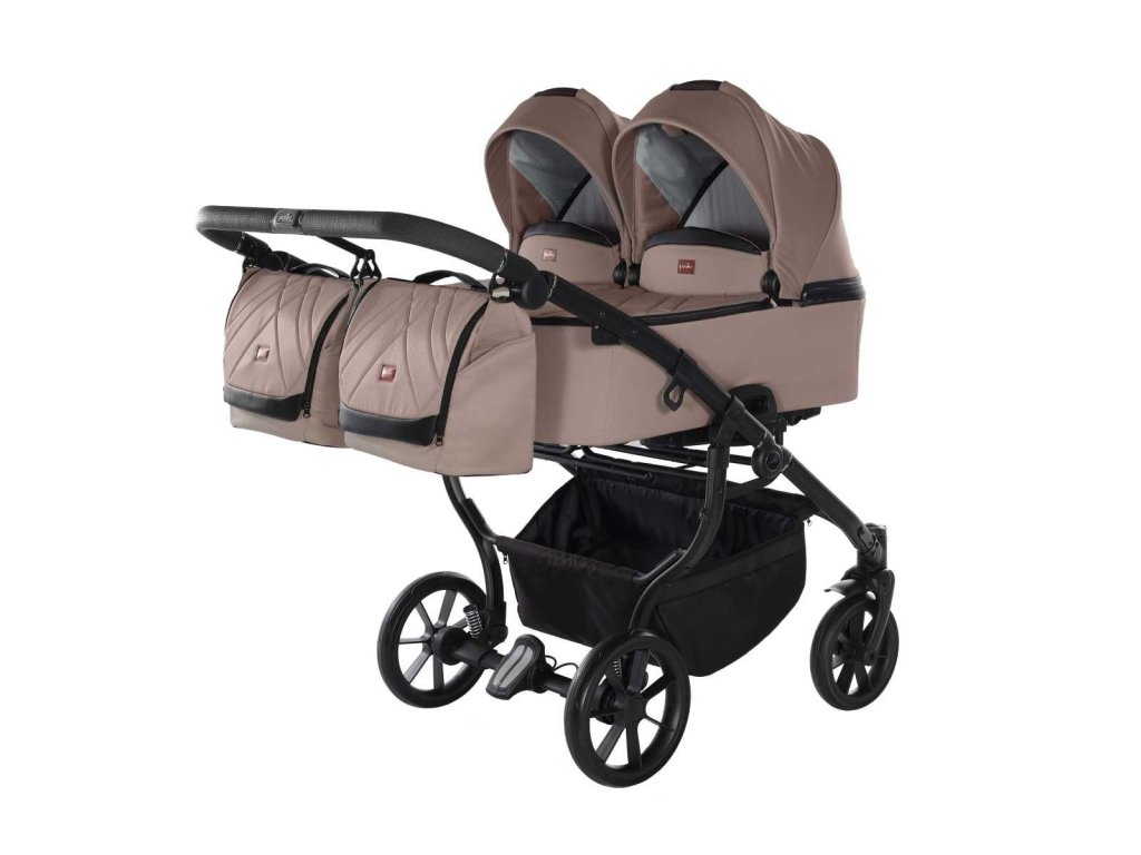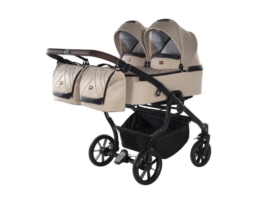 Dětský kočárek pro sourozence obsahuje podvozek s lehkou, hliníkovou konstrukcí a předními, otočnými koly pro dynamickou jízdu v různých typech terénu. Kvalitní pérování zadních kol a centrální brzda zajišťují stabilní a bezpečnou jízdu s kočárkem. Pohodlnou jízdu zabezpečí polohovatelné řídítka opatřené měkkou gumou pro komfortní úchop. Podvozek má prostorný košík.