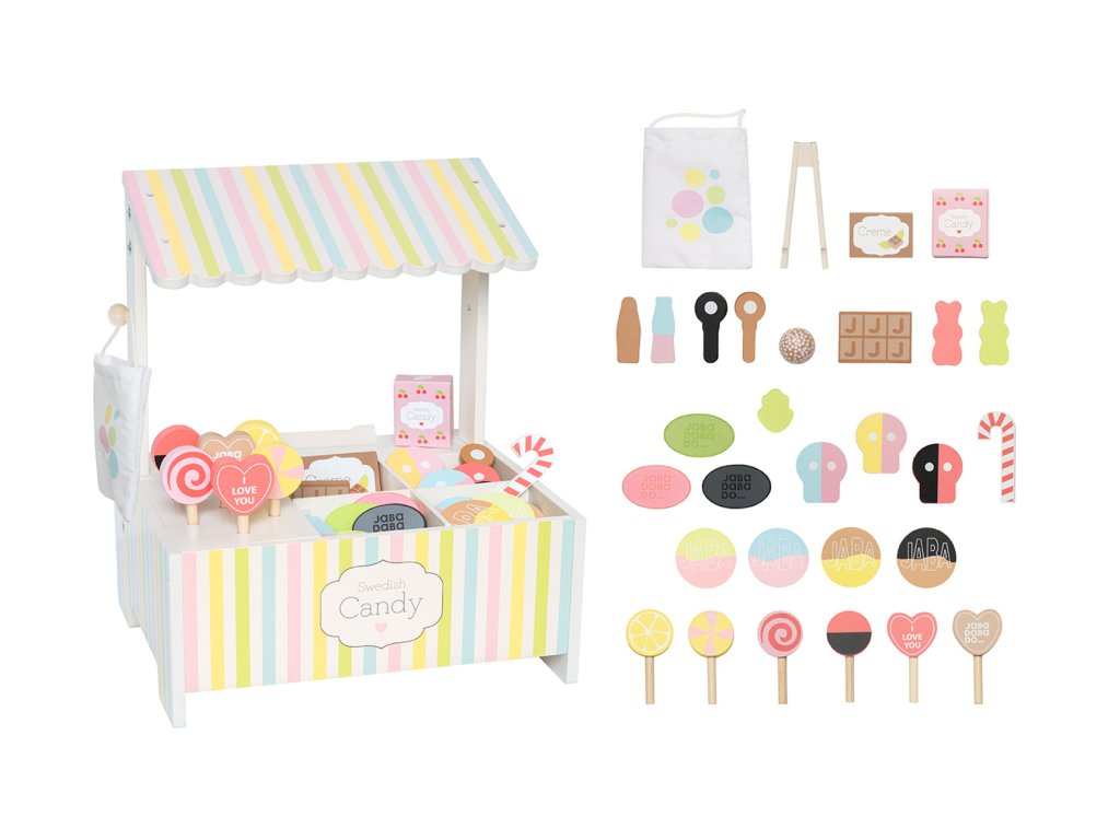 Objevte rozkošný švédský obchod se sladkostmi – půvabnou dřevěnou hračku inspirovanou klasickými švédskými oblíbenými cukrovinkami. Díky svým jemným barvám a nadčasovému designu se tento obchod se sladkostmi rychle stane oblíbenou součástí každé dětské herny. Je to místo, kde ožívají malé rukojeti a velká fantazie a každý čas hry naplňuje radostí a kreativitou. Obchod překypuje detaily a doplňky, díky nimž je hra realistická. Součástí balení je více než 25 různých dílků, jako jsou barevné lízátka, čokoládové tyčinky, cukrové hole a želé bonbóny – vše vyrobeno z udržitelného dřeva. Pro zvýšení autenticity je sada dodávána s látkovým sáčkem na bonbóny a klíšťaty, které hernímu zážitku dodávají zábavný a vzdělávací rozměr. Tento obchod se sladkostmi není jen zábavná hračka; je to i skvělý zdroj nápaditého hraní rolí, které podporuje sociální interakci a kreativní vyprávění příběhů. Perfektně dimenzován pro malé ručky a velké sny.