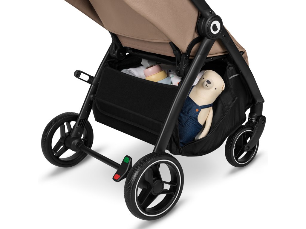 Univerzální kola: Velká bezúdržbová kola z EVA pěny se vyznačují univerzálností – jsou jak lehká, tak i odolná. Díky možnosti otáčení o 360° jsou kola velmi dobře ovladatelná a zajišťují manévrovatelnost. Dvojité odpružení umístěné vpředu i vzadu zaručuje pohodlí i při překonávání nerovností. Kočárek má centrální nožní brzdu se signalizací.