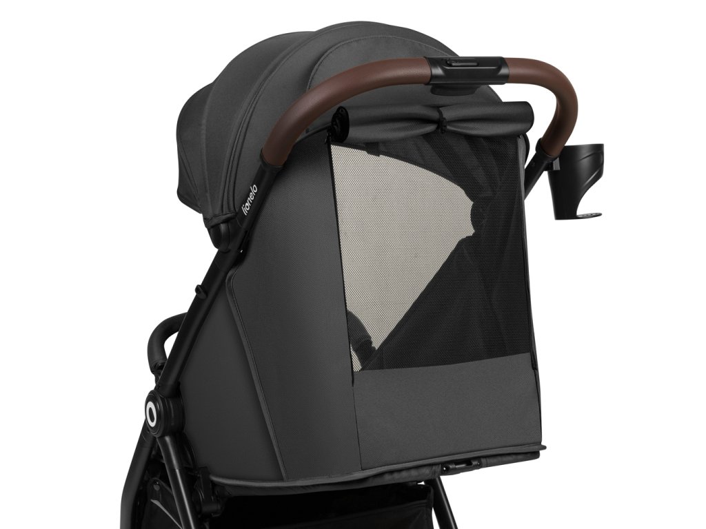 Sada: Kromě základní výbavy, jako jsou rám a kolečka, do sady patří také praktický držák na hrnek, který lze připevnit na rám kočárku, a moskytiéra.