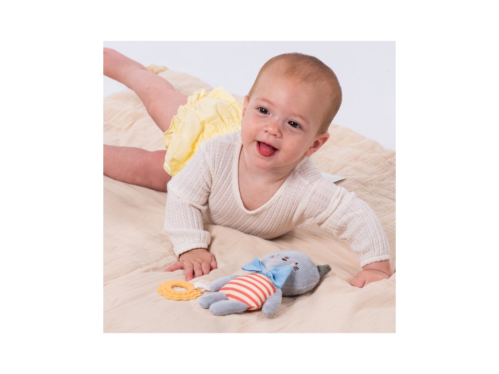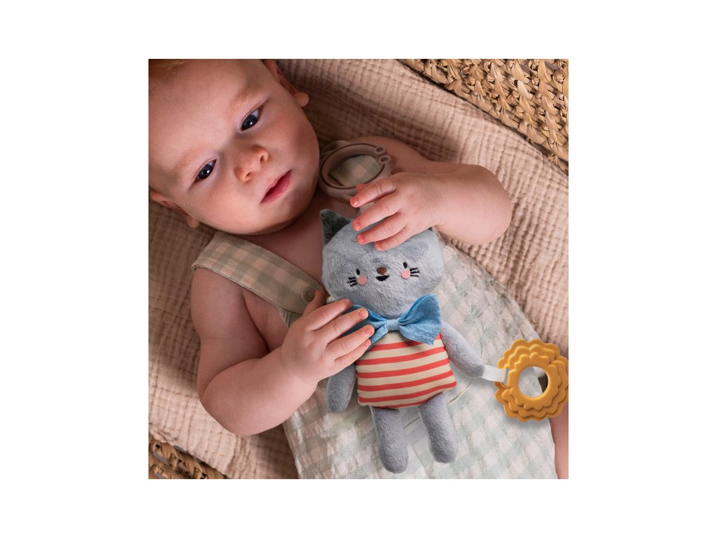Závěsná plyšová hračka v podobě roztomilé kočičky Clary při pohybu chrastí a při zmáčknutí šustí. Součástí hračky je i pružné kousátko ve tvaru kytičky. Díky závěsnému kroužku hračku snadno připevníte např. na autosedačku či kočárek. Hračka pomáhá rozvíjet jednotlivé smysly, motoriku a emoční inteligenci dítěte. Vhodné pro děti od narození.Doplňkové parametry