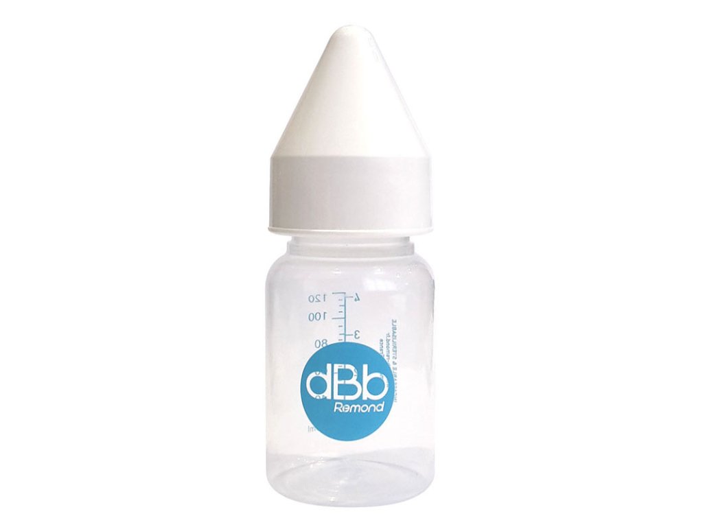 Kojenecká lahvička dBb Remond PP 120 ml savička kaučuk NN - šroubovací kroužek a hygienické víčko - vše z polypropylénu bez BPA. Objem je uzpůsoben pro novorozence a později lahvička poslouží pro ovocné šťávy a džusy. Speciální novorozenecká savička z kaučuku se dvěma otvory zabraňuje ublinkávání a regulace přisávání vzduchu omezuje jeho polykání a následné bolesti bříška s pláčem. Válcový tvar usnadňuje čištění. Je velmi lehká prakticky nerozbitná a dodává se v krabičce.